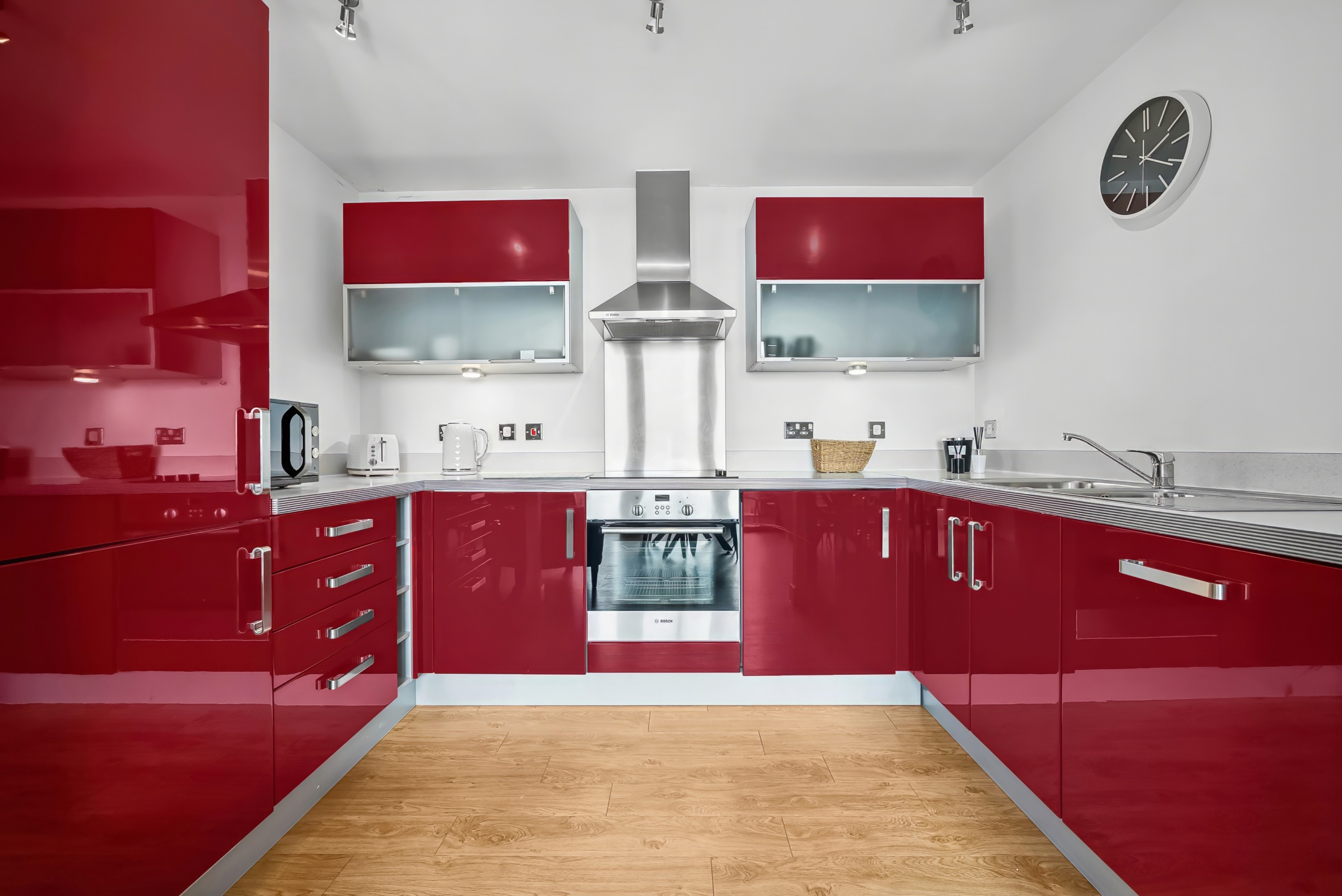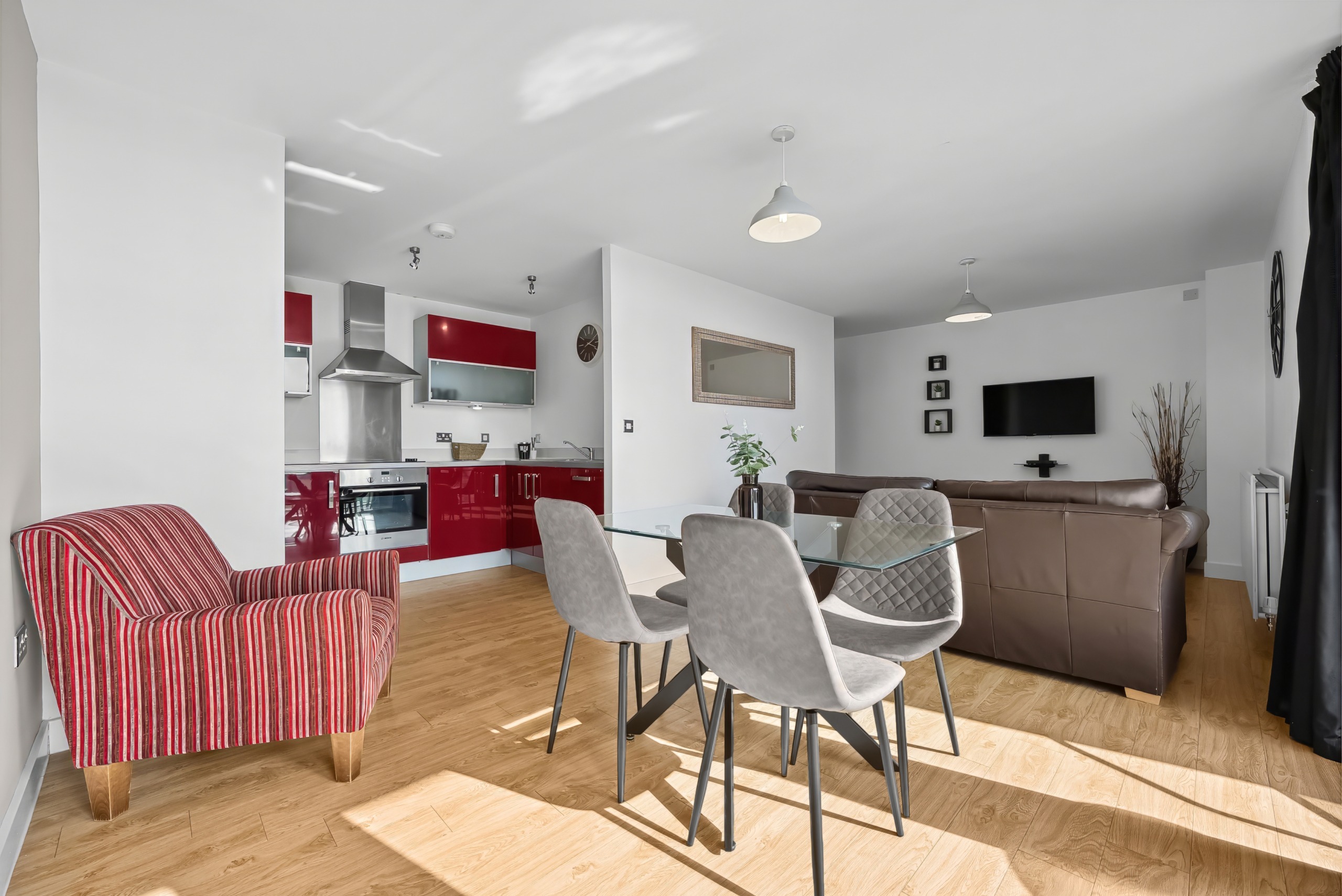 Each apartment features high-quality fixtures and fittings throughout. The fully equipped kitchens boast sleek built-in appliances and high-gloss cabinets, while the open-plan living and dining area provides a spacious and stylish environment for relaxation or work. The well-appointed double bedroom includes a TV for added comfort, and the separate bathroom—complete with a bath and shower even include a rubber duck to add a playful touch to your bath time!